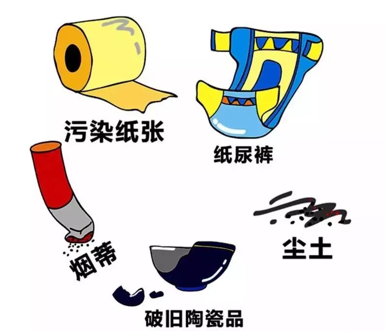指有毒有害垃圾、 可回收垃圾及其他垃圾等,主要包括廢電池、溫度計,廢舊電子產(chǎn)品、過期藥品過期化妝用品,廢油漆桶和粉塵、廢棄農(nóng)藥、化肥及農(nóng)藥包裝物等有毒有害垃圾;衛(wèi)生間廢紙,紙巾、煙灰煙蒂、貝殼等其他垃圾以及報紙書刊類、塑料、農(nóng)用殘膜、玻璃、金屬和織物等可回收垃圾。